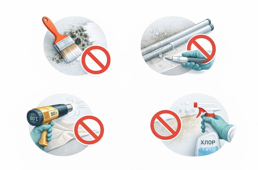• Не закрашивайте и не маскируйте плесень. Это усугубит рост: споры останутся живыми под краской, а влага продолжит накапливаться.